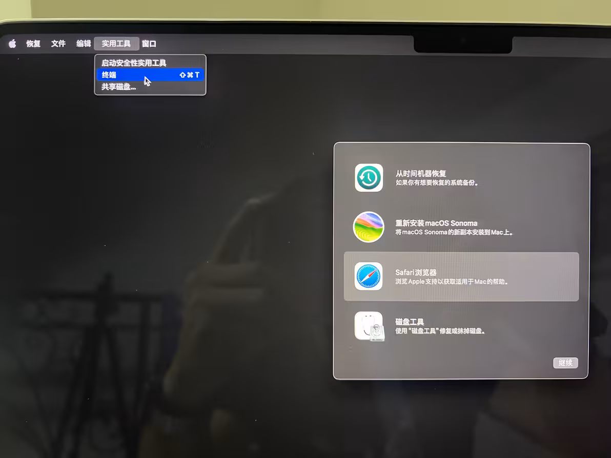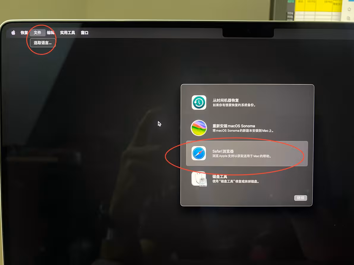 +进入恢复模式后在菜单中打开Safari浏览器(记得联网)