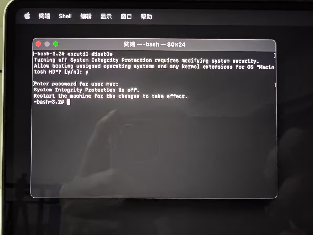 +成功后重启进恢复打开终端输入“csrutil disable”并回车